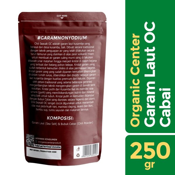 OC – Chili Sea Salt is kusamba sea salt, traditionally produced by local farmers who produce high-quality salt with a savory taste. It is processed by evaporating it on volcanic sand spread out on the beach under the sun, then distilled to obtain pure salt water which is dried in containers made from coconut tree trunks and sun-dried to obtain pure salt crystals by farmers to be further dried and cleaned to produce high-quality non-iodized pure salt.