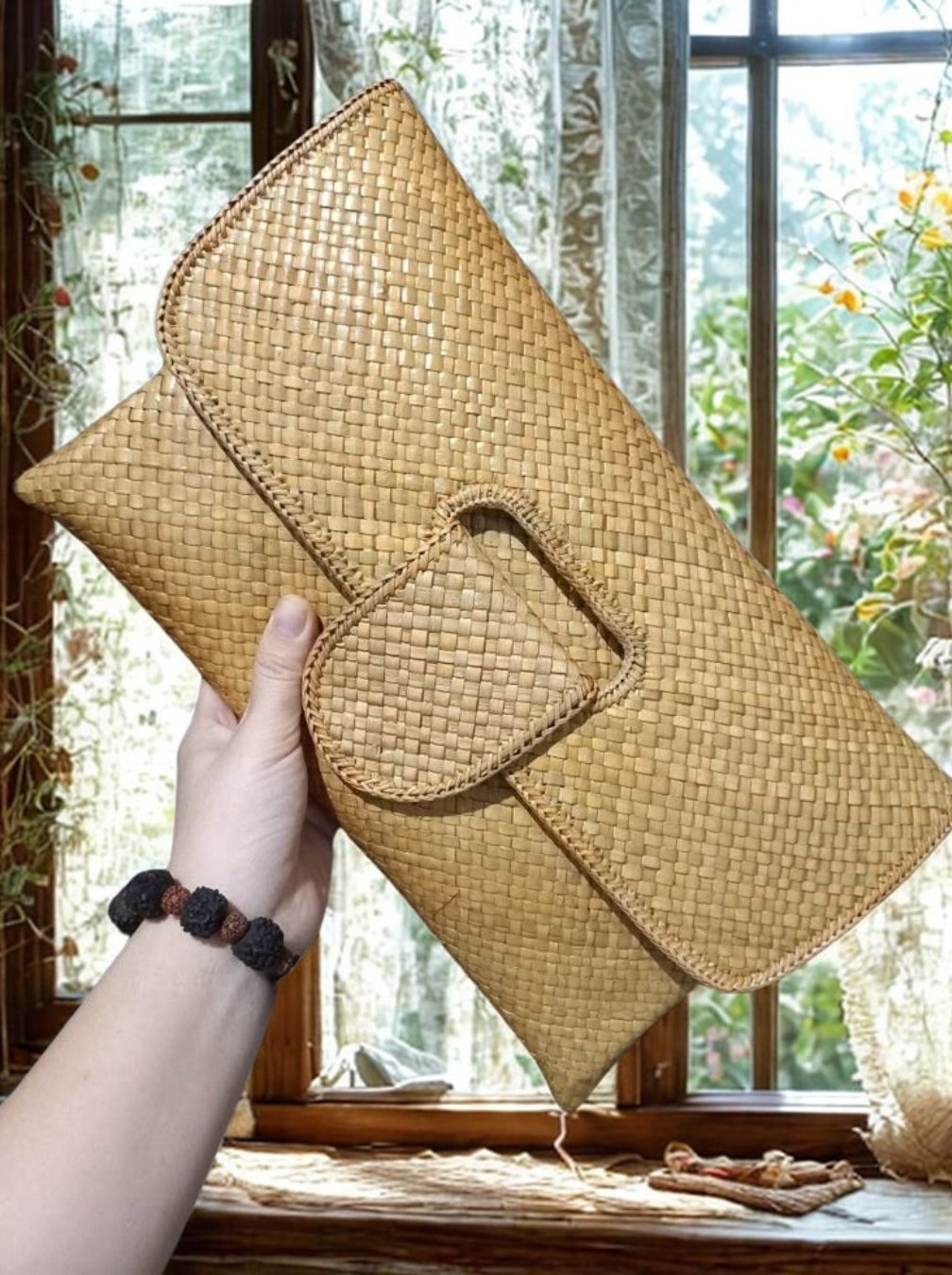 Sari Dusk Clutch is more than a bag — it’s an expression of elegance and cultural craftsmanship. Its sleek fold-over design with a square buckle detail adds modern sophistication, while the natural woven rattan texture gives it a warm, organic charm. This versatile piece transitions effortlessly from day to night, making it your perfect go-to clutch tote.