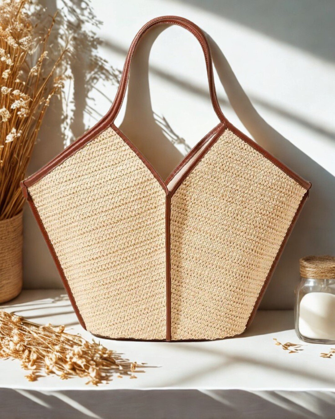 The Sienna Fold Tote is where natural craftsmanship meets modern elegance. Designed with a unique folding trapezoid silhouette and finished with smooth leather trim, this tote is the perfect companion for effortless style — from city streets to coastal escapes.
