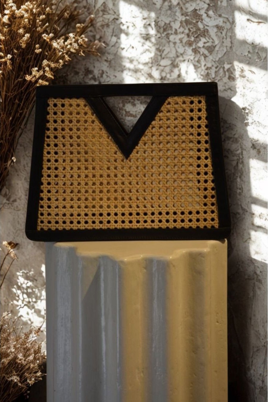 - Design: Unique trapezoid silhouette with a bold inverted V-cut top handle framed in black faux leather, showcasing a striking balance of modern geometry and traditional weaving.